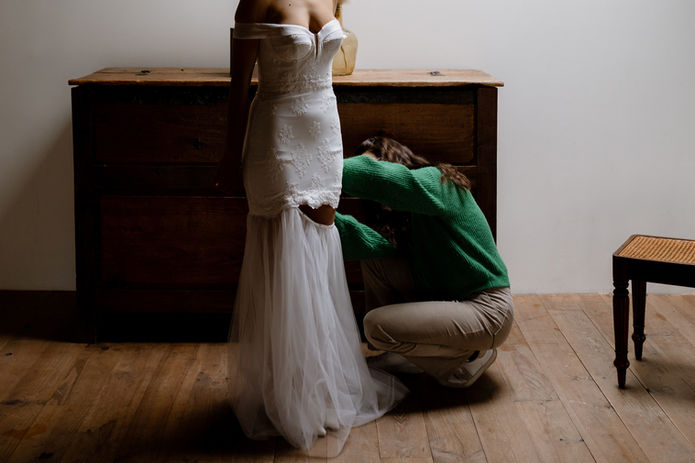 Pour les mariées modernes qui préfèrent un pantalon ample mais ceintré ! Accompagné de ce délicat corset en crepe et tulle brodé. Les bagues sur les gants brodés sont réalisés sur-mesure et personnalisés, par une créatrice Toulousaine.